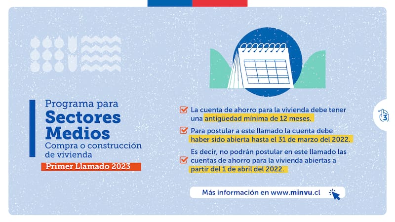El llamado Programa para Sectores Medios del Ministerio de Vivienda y Urbanismo (Minvu) abrirá el proceso el 19 de abril y se extenderá hasta el 28 del mismo mes, en el marco del primer llamado individual del año para solicitar financiamiento para compra o construcción.