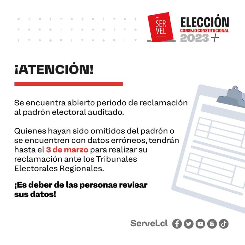 El periodo de reclamación al padrón electoral auditado, según la información entregada por el Servicio Electoral (Servel), es desde el lunes 27 de febrero al viernes 3 de marzo de 2023.