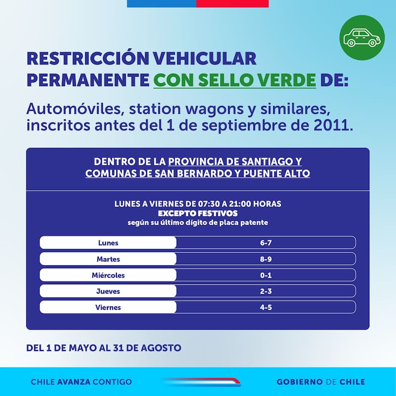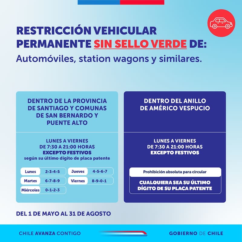 Cabe recordar que la medida aplica de lunes a viernes entre 7:30 y 21:00 horas, en toda la provincia de Santiago y comunas de San Bernardo y Puente Alto.