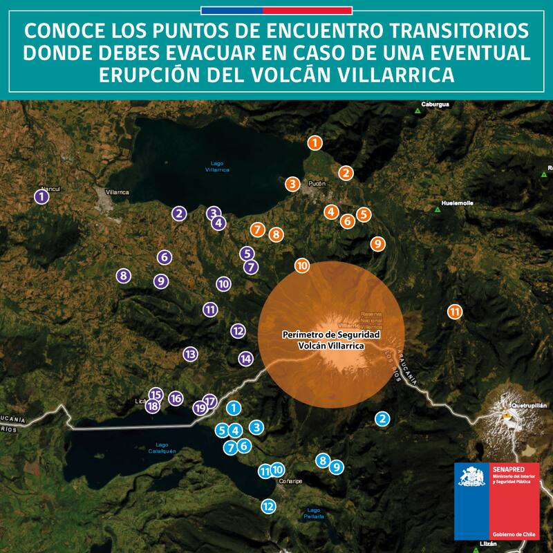 Además, la entidad entregó un mapa que contiene los puntos de encuentro transitorios, hacia los cuales se debe evacuar ante una eventual erupción del macizo.