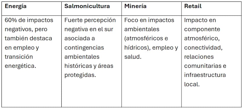 Para comprender la percepción de impactos socioambientales en los territorios donde se emplazan proyectos productivos, la consultora Gestión Social analizó 41 diagnósticos territoriales realizados entre 2021 y 2024 desde Arica y Parinacota hasta Magallanes, abarcando sectores como energía, minería, salmonicultura, inmobiliario, retail y educación.