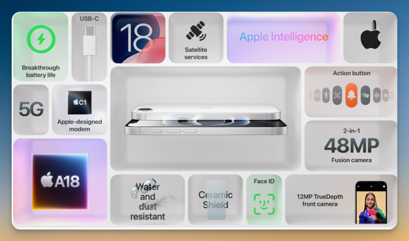 El iPhone 16e estará potenciado con el chip A18, el mismo del iPhone 16, junto a 8GB de RAM que le permitirá recibir todas las funciones de Apple Intelligence. Asimismo, promete una batería de larga duración de hasta 26 horas.