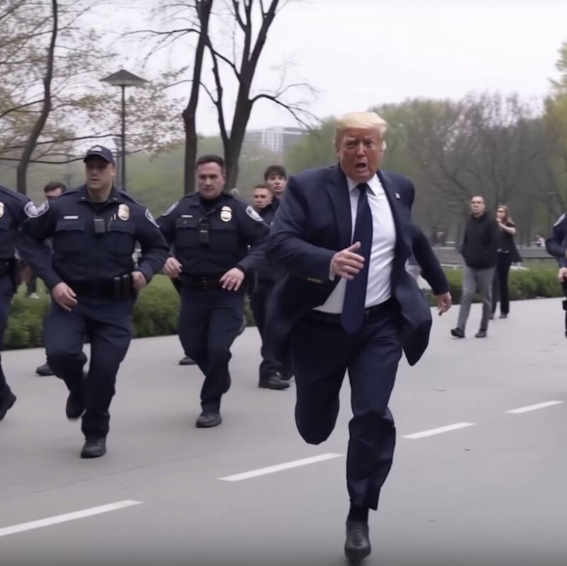 “Haciendo fotos de Trump siendo arrestado mientras espero el arresto de Trump”, escribió Higgins en el tweet. El periodista acompañó esa frase junto a las imágenes que generó con IA, donde se observa a un arrebatado Donald Trump, vestido de terno, en el momento en que un grupo de agentes policiales intenta atraparlo.
