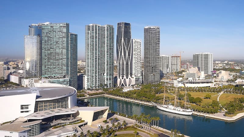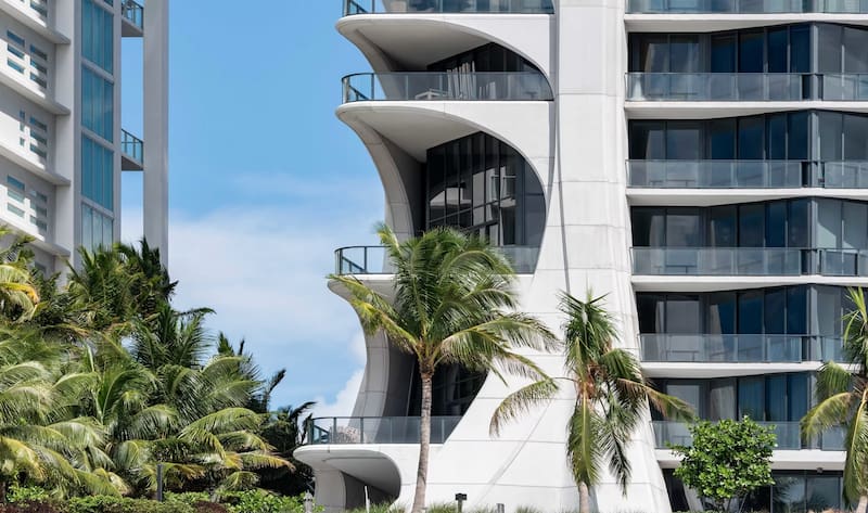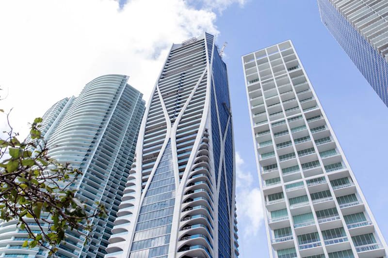 Entre los lujos del edificio de 62 pisos destacan un helipuerto privado, piscinas cubiertas y al aire libre, y un distintivo exoesqueleto de hormigón en forma de rombos, visible desde gran parte de Miami.