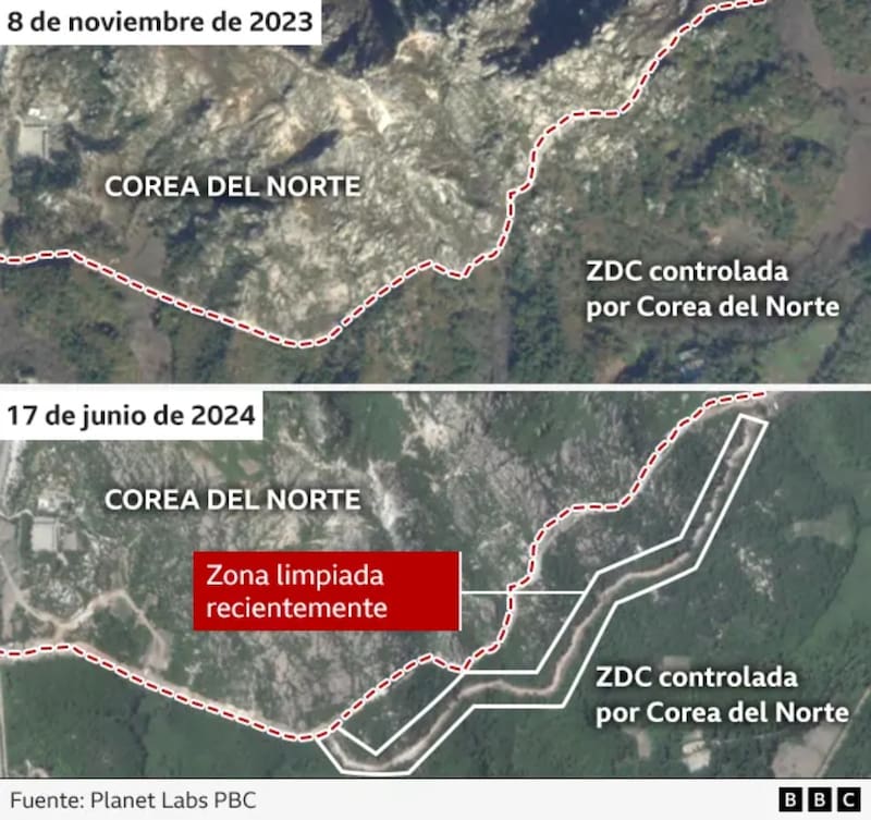 Un extenso muro en distintas zonas cercanas a la frontera con Corea del Sur. Ese es el proyecto que Kim Jong-un estaría trabajando, según revelaron un par de imágenes satelitales que publicó la BBC, donde se ven ciertas estructuras y terrenos que están siendo despejados.