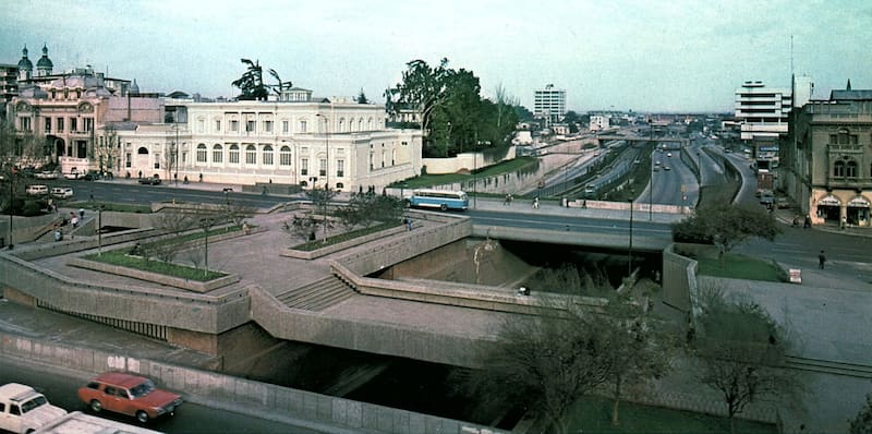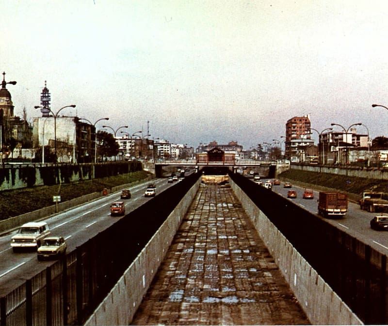 Otro interesante punto de vista es la construcción de la Línea 2, donde al fondo se puede ver la icónica estructura de la estación Santa Ana y, después, el acceso a la misma, antes de ser inaugurada.