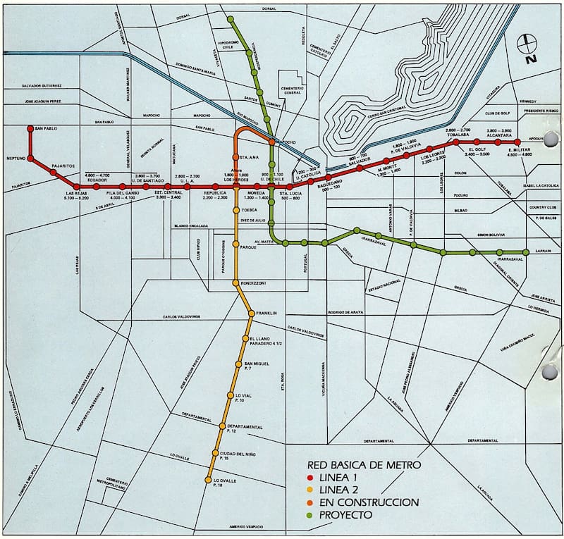 La imagen muestra la Línea 1, que solo llegaba hasta la estación Escuela Militar, y una muy acotada Línea 2, cuya extensión (el tramo Los Héroes-Mapocho) estaba en construcción. Además, la línea verde denota el proyecto que hoy conocemos como la Línea 3, aunque las estaciones son muy distintas a las que se planearon inicialmente.