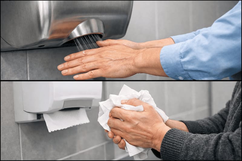 En la rutina diaria, muchas personas utilizan baños públicos, que generalmente tienen dos opciones para secar las manos: toallas de papel desechables y secadores de aire eléctricos.