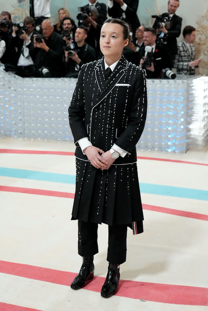 El protagonista de la exitosa serie estrenada este año en el streaming, The Last of US, llegó a la ceremonia con un atrevido conjunto a cargo de Valentino, el cual consistió en shorts, botas altas y una corbata negra, elementos que hicieron contraste con una camisa y un abrigo rojo de corte largo.