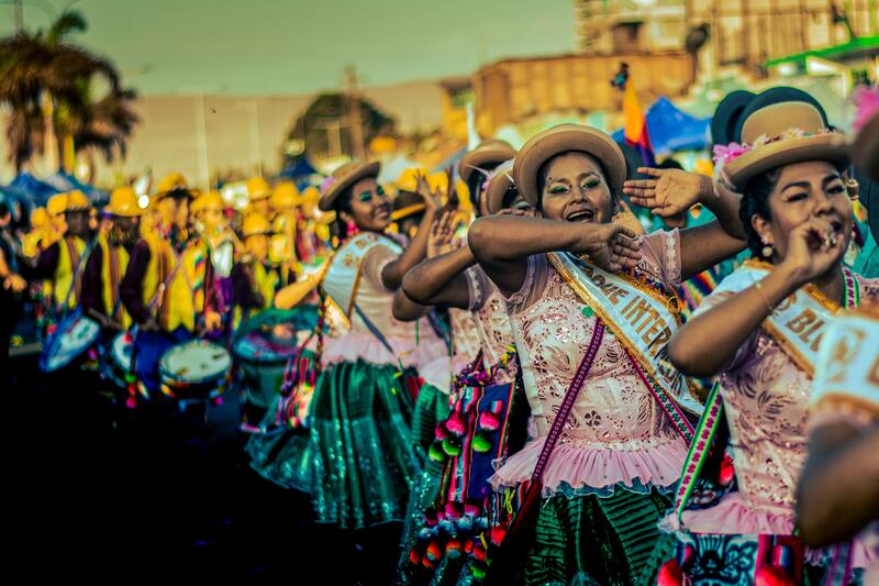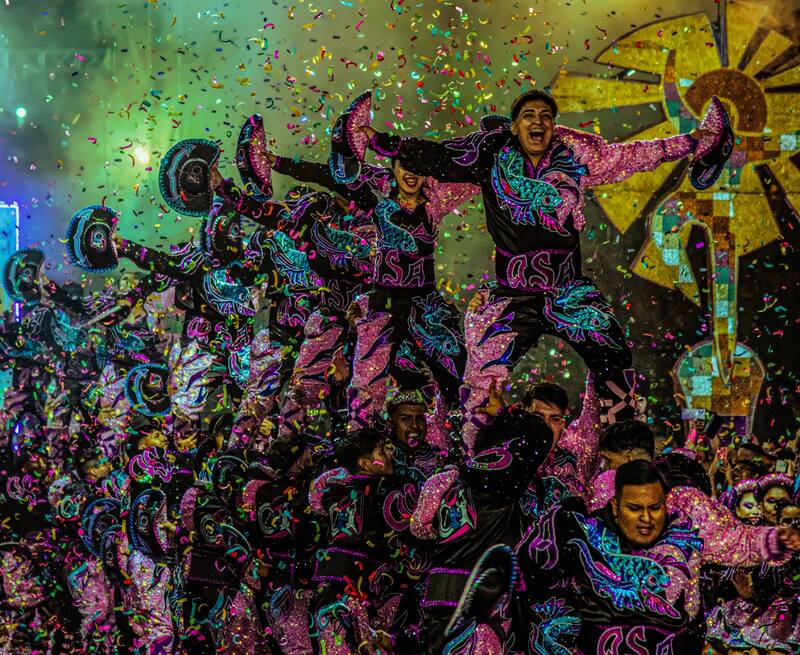 Miles de asistentes gritando y cantando a viva voz y el sonido de las bandas dándole ritmo a los bailarines, quienes con sus trajes hechos a mano, de colores y brillosos se roban la mirada de todos, excepto de la televisión nacional.