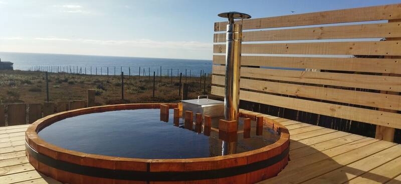El espacio ofrece una tinaja privada con vistas al mar, estufa de leña, Internet de alta velocidad y proyector. Por $150 mil la noche con hasta cinco huéspedes.