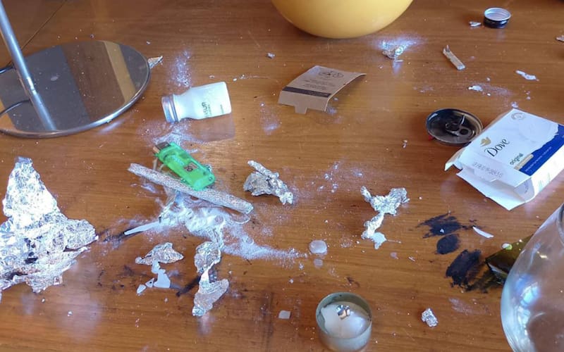 En otras fotos se logra apreciar trozos de papel aluminio, velas, fósforos, un encendedor, un envase de jabón Dove y lo que se presume son restos de droga.
