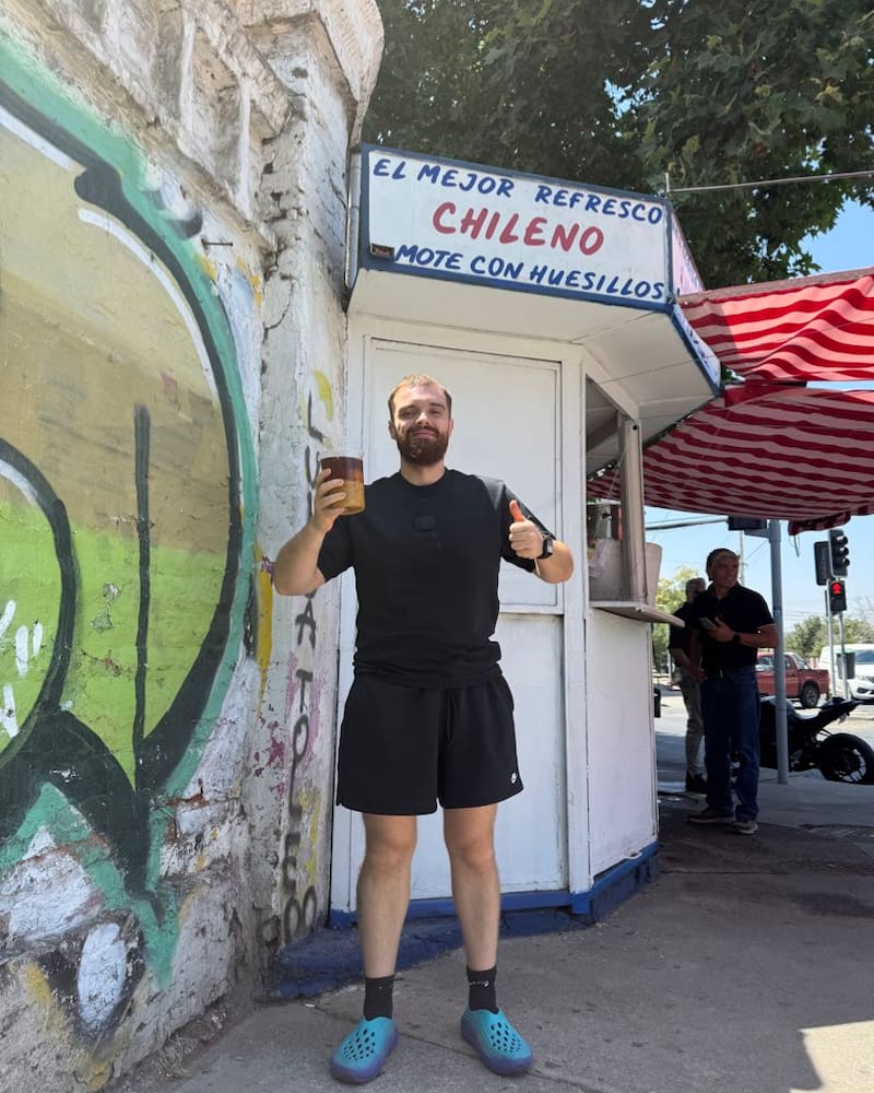 Otra postal que subió el creador de contenido a su cuenta de X, es una foto de él tomando un clásico mote con huesillo en el local “El Rey del Mote con Huesillo”.