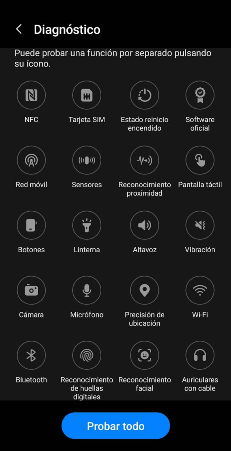 -Si decides hacer un diagnóstico parcial de tu equipo, podrás revisar el funcionamiento de componentes como: NFC, Tarjeta SIM, Estado reinicio encendido, Software inicial, Red móvil, Sensores, Reconocimiento proximidad, Pantalla táctil, Botones, Linterna, Altavoz, Vibración, Cámara, Micrófono, Precisión de ubicación, Wi-Fi, Bluetooth, Reconocimiento de huellas digitales, Reconocimiento facial, Auriculares con cable, Conexión USB, S Pen, Carga por cable, Carga inalámbrica y Estado de la batería.