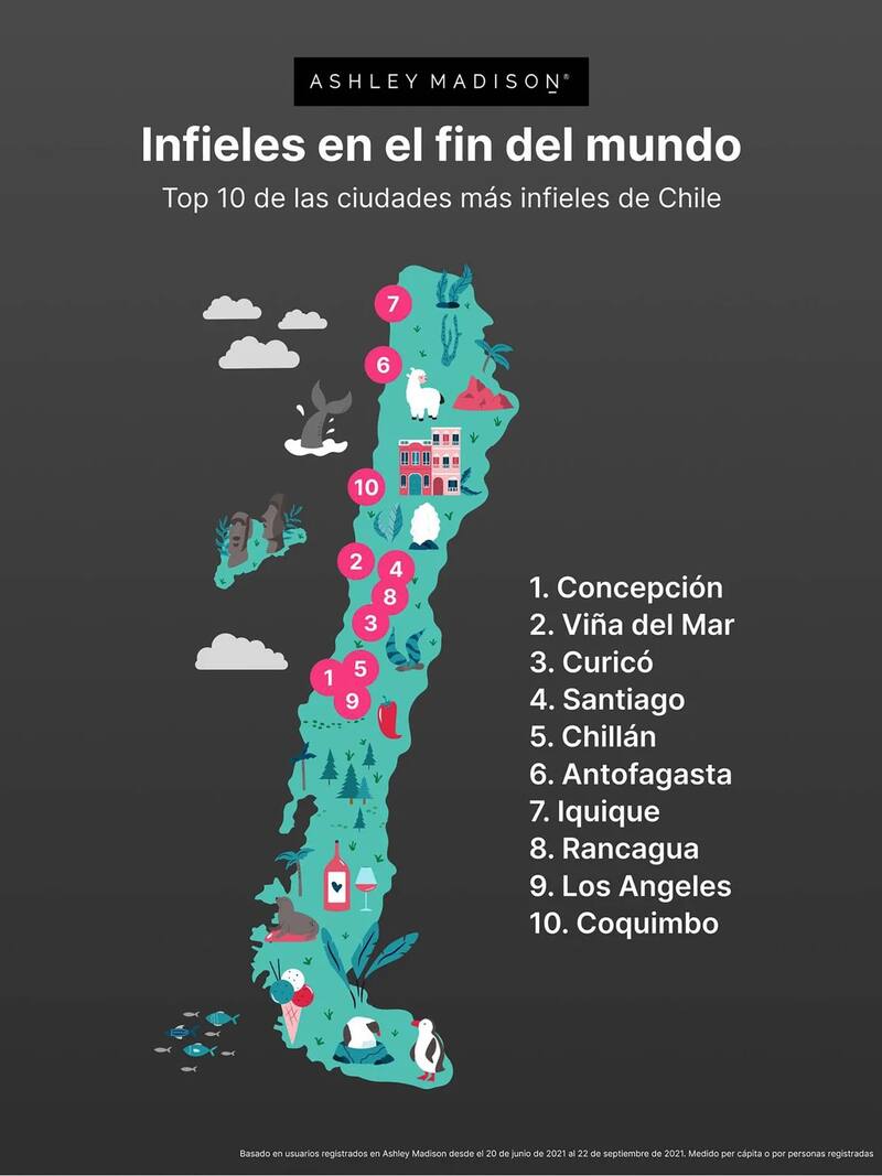 Otras cifras reveladas el año pasado por un sitio similar, Ashley Madison, detallaron cuáles eran las ciudades del país con más cibernautas en su plataforma. En esa lista, destacaron que “desde Iquique hasta Los Ángeles, hay muchas personas con ideas afines esperando conectarse” y que Concepción figuró como la primera en el ránking y Viña del Mar como la segunda.