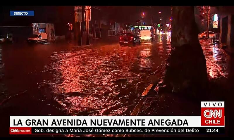 Llueve torrencialmente en Santiago y el mal drenaje hace que la Gran Avenida del sur de la ciudad se inunde. Al menos eso muestra la televisión que llega al resto del país: pasos bajo nivel anegados y gente literalmente “navegando” donde antes había solo pavimento. Han caído poco más de 10 mm de lluvia y los colegios de comunas como El Bosque y San Miguel suspenden sus clases de manera preventiva.