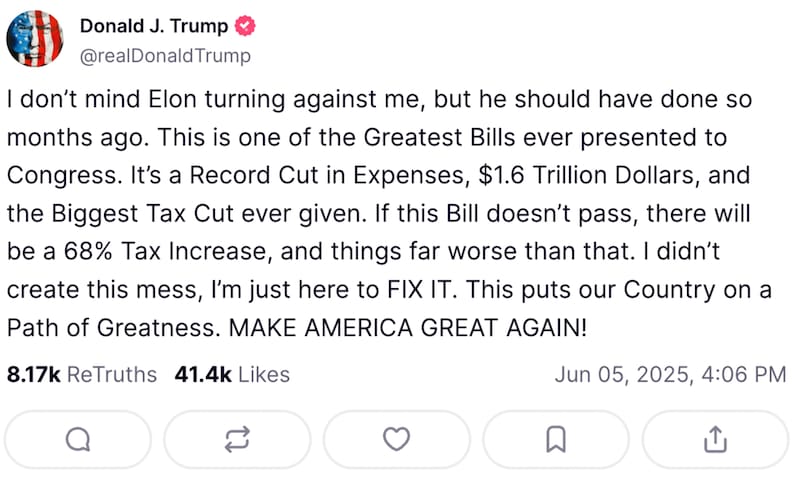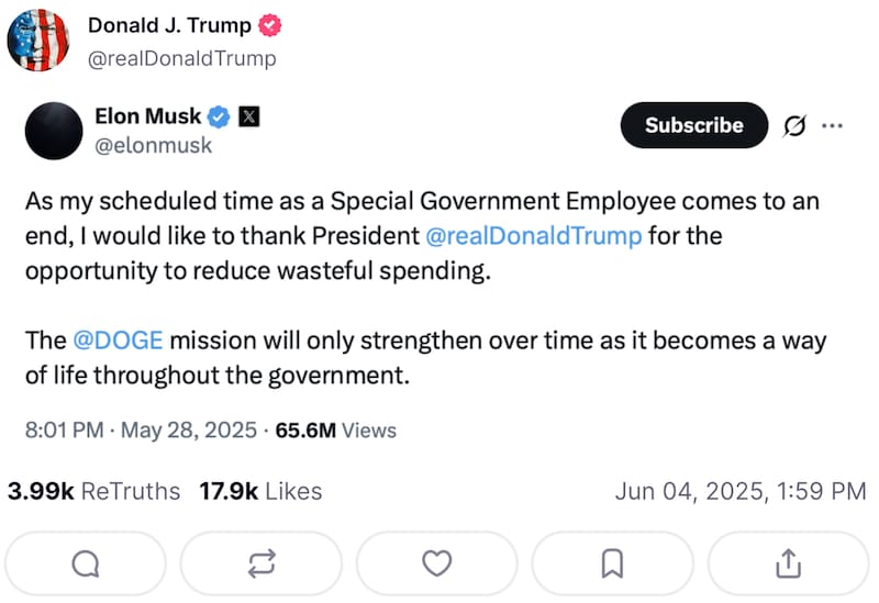 Trump publicó en su red social, Truth Social, una imagen de una publicación que Musk hizo en X el 28 de mayo, en la que anunció que dejaría de trabajar con el gobierno.