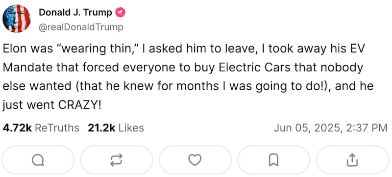 Trump dijo en una publicación en Truth Social que le pidió a Musk que abandonara su administración y que le quitó “su mandato de vehículos eléctricos”.