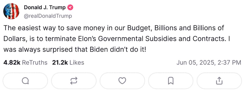 El presidente afirmó en Truth Social que el gobierno estadounidense podría ahorrar miles de millones de dólares en su presupuesto al rescindir los contratos y subsidios otorgados a las empresas de Musk.