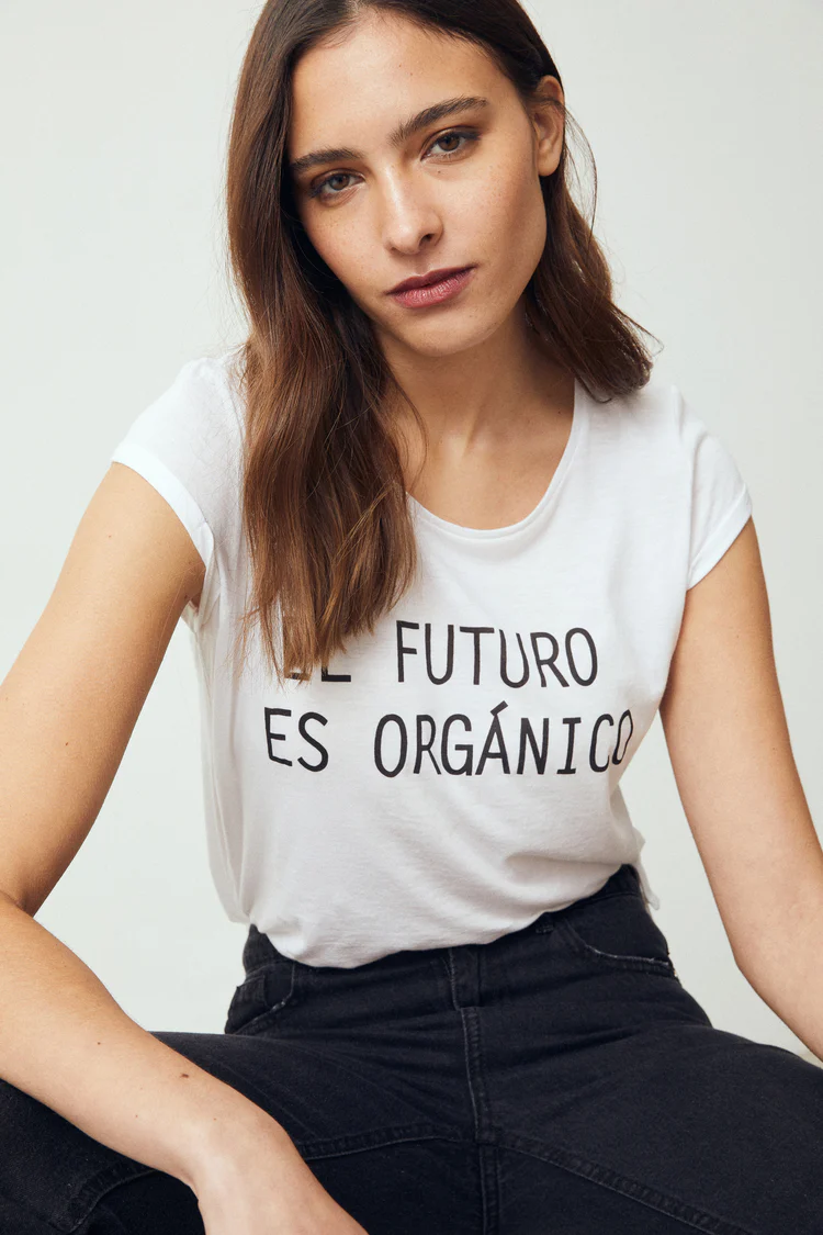 Uno de los más llamativos disponibles en su página web es una polera blanca sin mangas, en la que se lee “el futuro es orgánico” con letras negras.