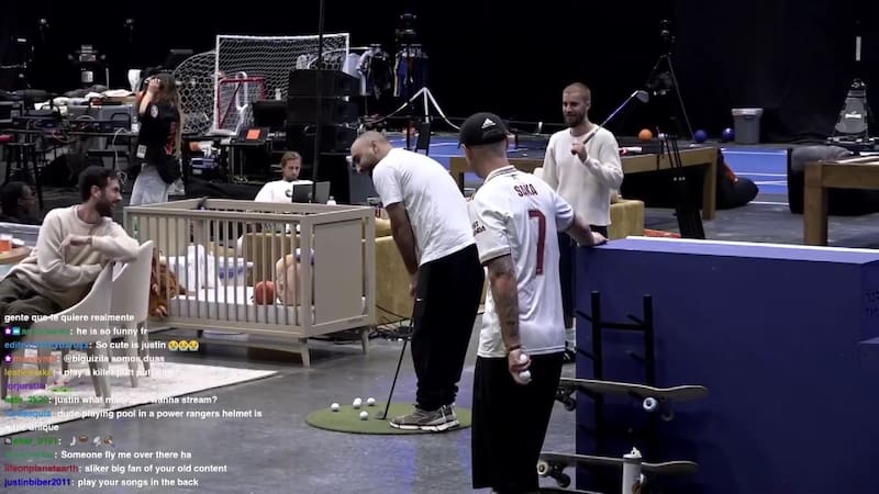 Bieber transmitió desde un enorme estudio acondicionado como complejo deportivo. Cuenta con cancha de básquet, mesa de pool, rampa de skate, minigolf y un espacio para producir y crear música.