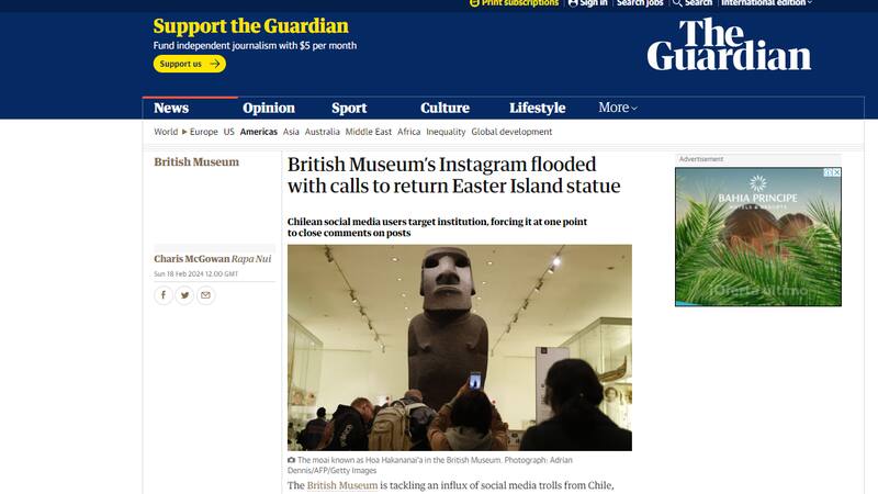 El diario británico The Guardian publicó un artículo sobre la ola de comentarios chilenos que ha recibido el Museo Británico en sus diferentes plataformas digitales. Los usuarios han exigido que devuelvan el Moai que se encuentra en su colección permanente desde 1869.