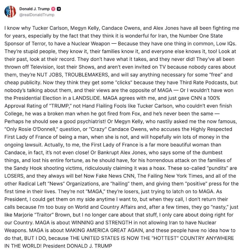 Por su parte, y ante el mismo caso de sus fuertes amenazas a Irán, Candace Owens, conocida por conducir podcasts de extrema derecha, lo llamó “lunático genocida”.