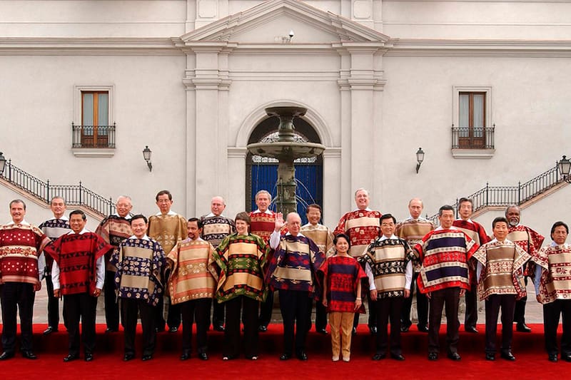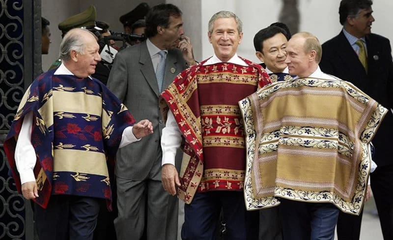 Tal vez la postal más recordada es la de Putin vestido de huaso chileno, junto a los mandatarios Lagos y Bush, con chamantos de Doñihue tejidos con hilo de seda y lana a doble faz.