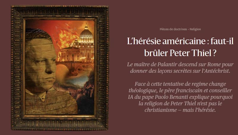 La autoridad eclesiástica redactó un ensayo bautizado como La herejía estadounidense: ¿Deberíamos quemar a Peter Thiel en la hoguera? —que se publicó en Le Grand Continent— donde asegura que el hombre “está intentando acelerar el declive de la democracia liberal para facilitar el funcionamiento de sus empresas”.