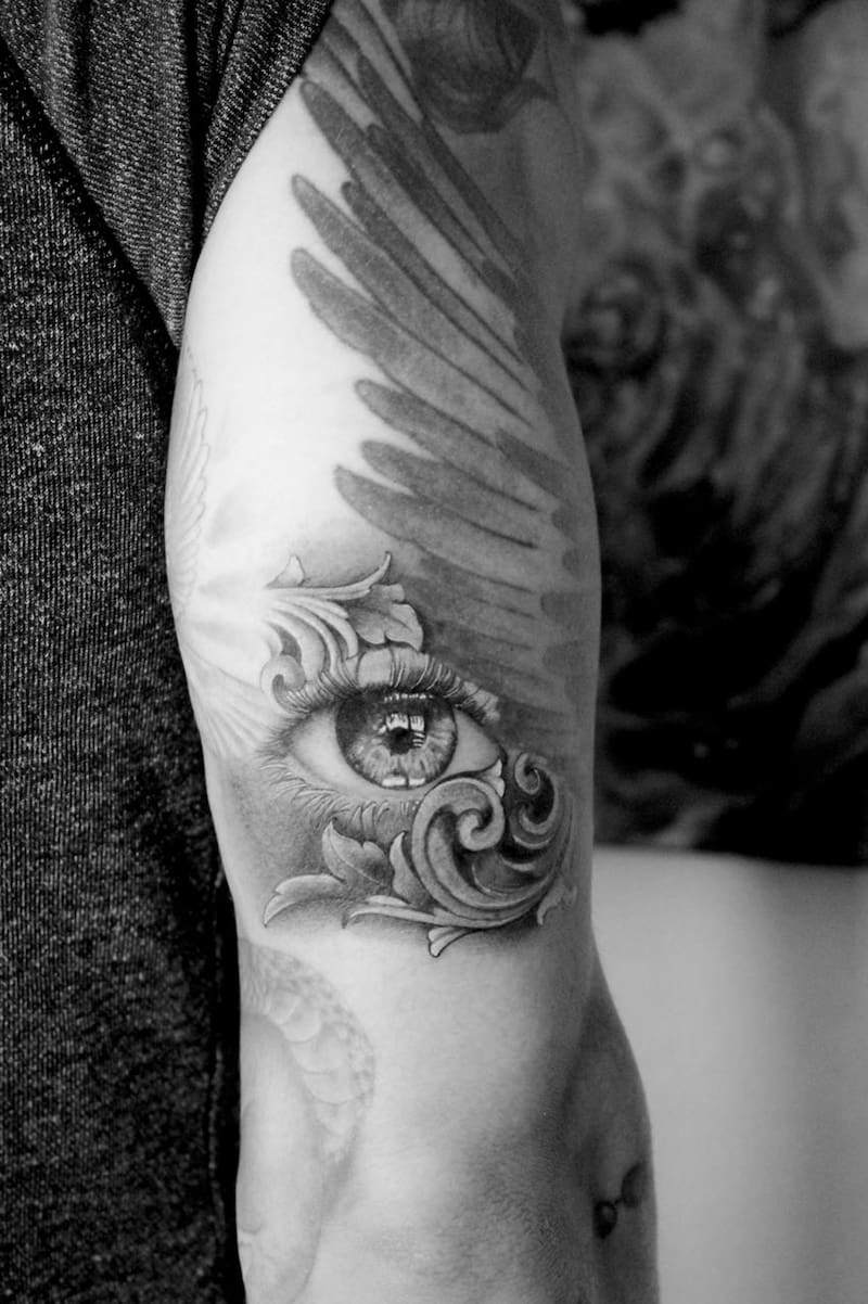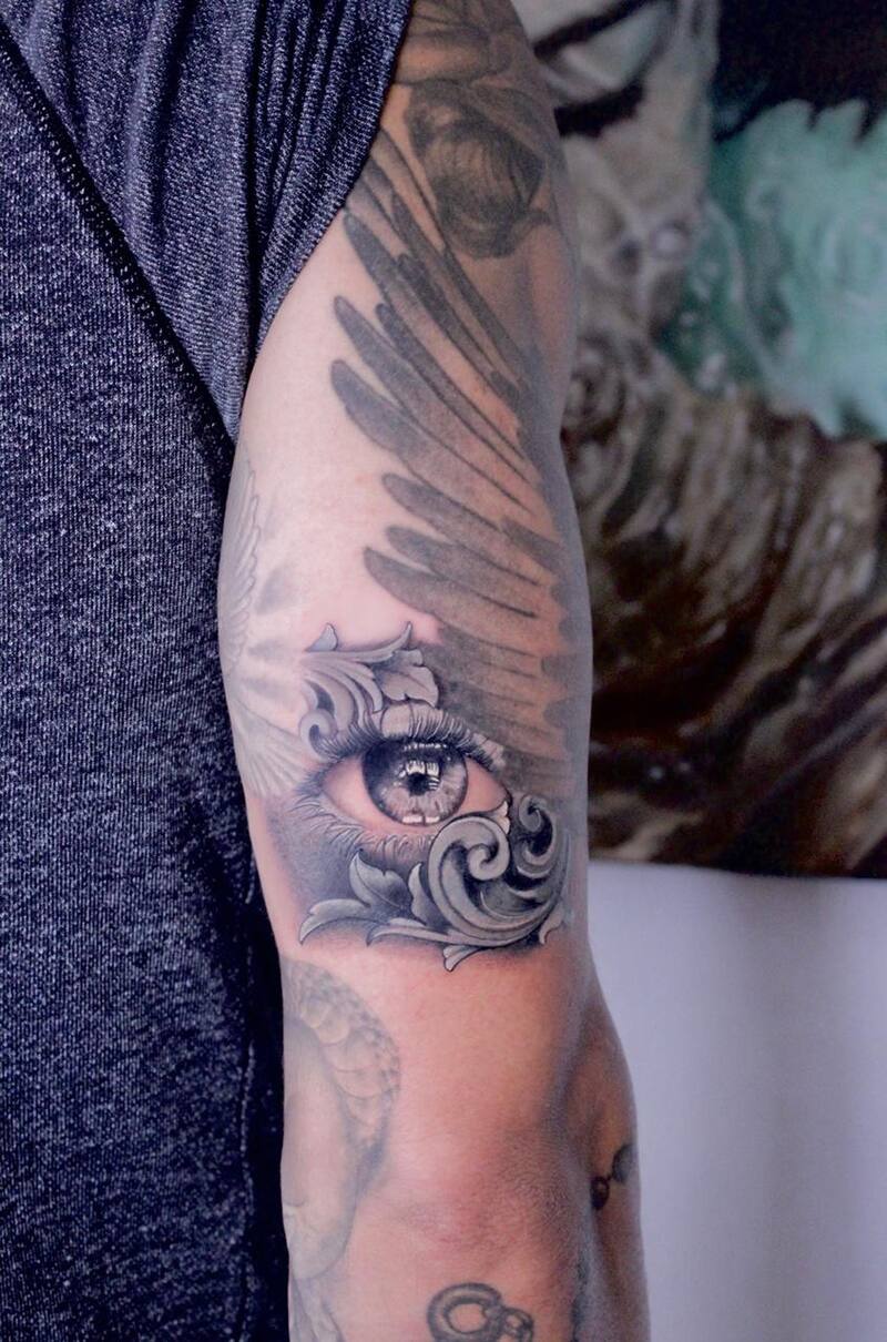 “Llegué finalmente a un ojo porque se puede hacer pequeño y también porque es horizontal, justo el espacio que él tenía en el tríceps. Me calzaba justo como para poder tapar ese tatuaje”, afirma. Después que dibujó el ojo fue agregando detalles y ornamentos, lo que le permitió ocultar mucho más el tatuaje estropeado.
