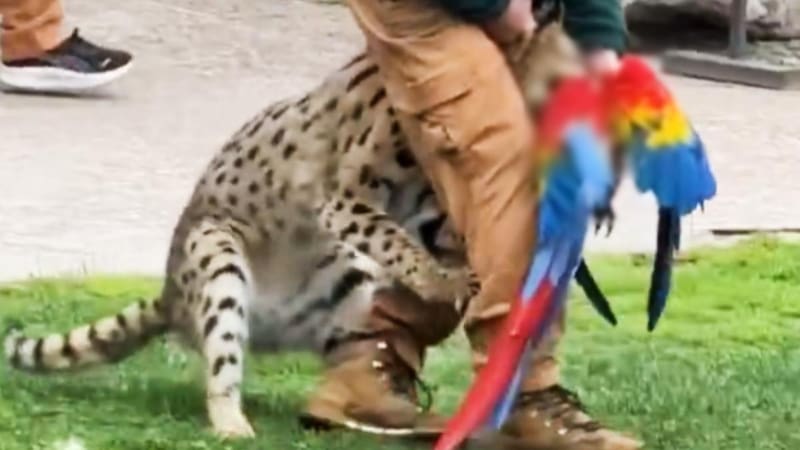 El video del suceso se viralizó rápidamente: en él, se veía a un serval —un felino salvaje africano, parecido a un leopardo pequeño— mordiendo al guacamayo, mientras que los cuidadores intentaban sacarlo de su hocico.