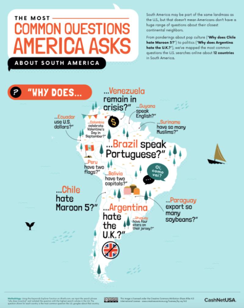 En el resto de Latinoamérica, otras preguntas estaban relacionadas con temas de idioma, economía y política, tales como “¿Por qué Brasil habla portugués?”, “¿Por qué Paraguay exporta tanta soja?” y “¿Por qué Argentina odia al Reino Unido?”.