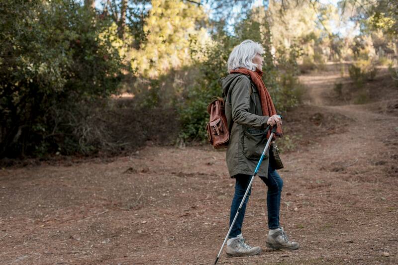 Uno de los secretos para acostumbrarse a realizar la caminata con bastones es balancear los brazos y mantener los codos rectos. Esto, mientras pones el bastón detrás de ti y empujas, mientras tu pierna opuesta avanza.