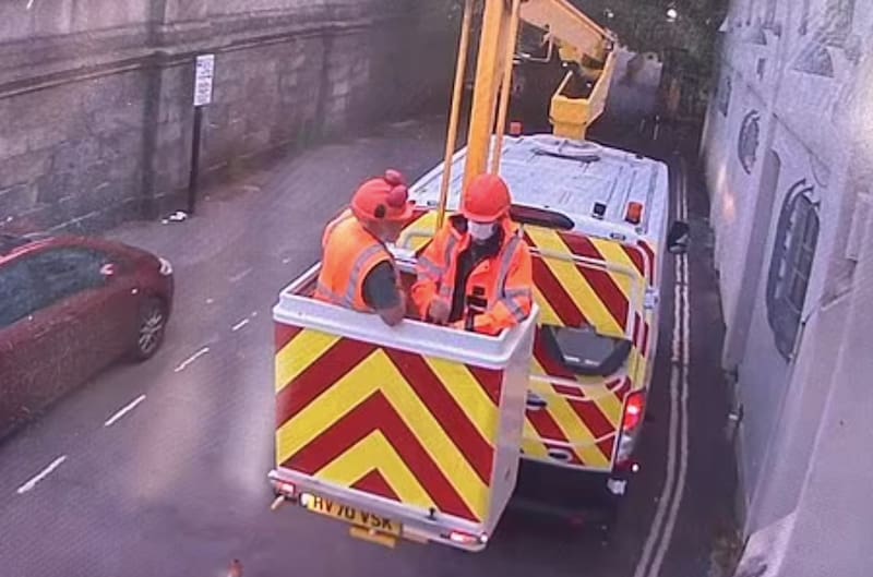 Los registros, obtenidos por una cámara de seguridad en la madrugada del lunes, muestran que dos hombres vestidos con ropa reflectante de color naranjo y cascos estaban en la parte trasera de un vehículo con plataforma elevadora. Uno de ellos lleva su cara tapada con una mascarilla y se cree que sería Banksy.