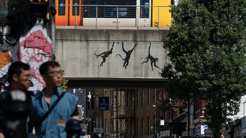 El miércoles el artista británico confirmó en sus redes sociales la autoría de una tercera obra, ubicada en un puente de la estación de metro de Shoreditch Street. Se trata de la silueta de tres monos colgando de distintas maneras, como si estuvieran a punto de caer a la calle.