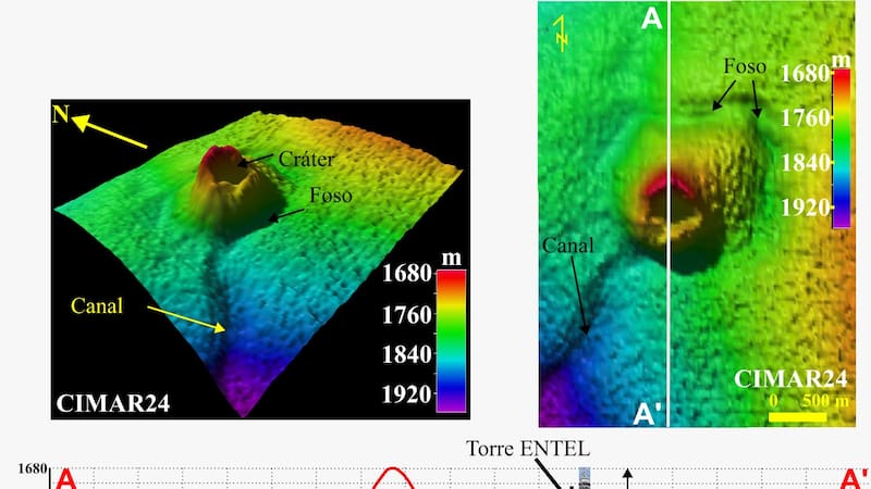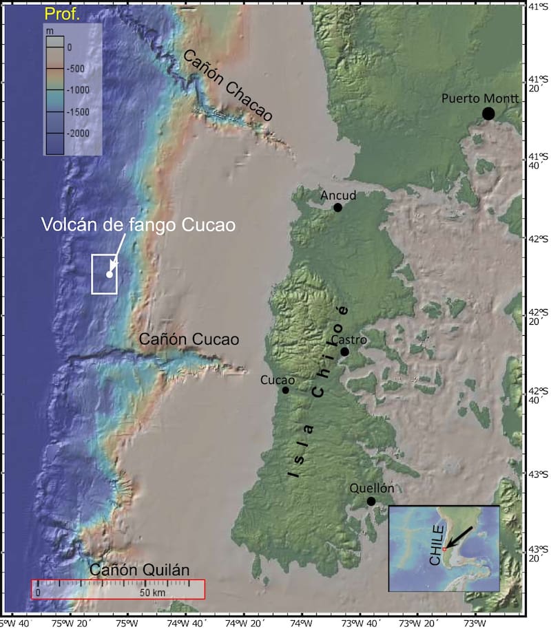 Bautizado como “Volcán de lodo de Cucao”, la estructura se encontraría a unos 86 kilómetros al oeste del archipiélago de Chiloé. Según detallan en el paper publicado en la revista científica Marine and Petroleum Geology, dependiente de Elsevier, tendría 1,5 kilómetros de diámetro y un cráter de 450 metros de ancho y 80 de profundidad.