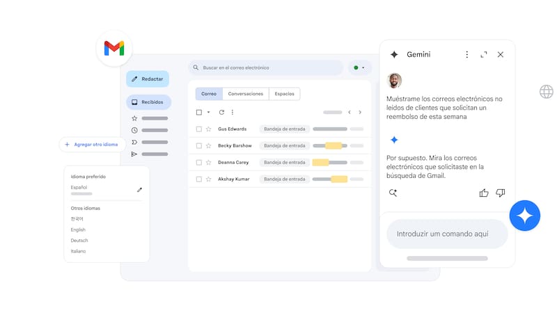 A contar de este viernes, lo clientes de tal servicio podrán hacer preguntas directas a Gemini, en un panel lateral, que dependiendo el servicio, responderá al pedido. Por ejemplo, en Gmail se podrá preguntar por correos sin facturas enviadas, resumir correos, etc. En Docs, pedir la elaboración de textos según la demanda.