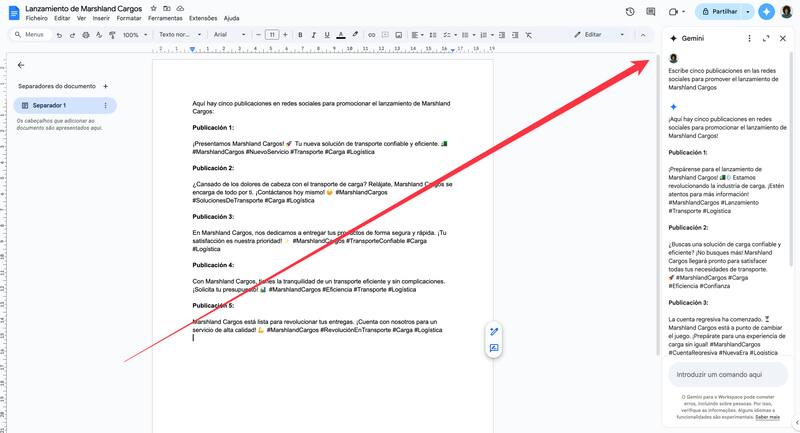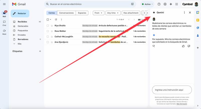Para habilitar esta función, los usuarios con Google Workspace sólo deben clickear el símbolo de Gemini en la esquina superior derecha donde dirá “pregúntale a Gemini” y realizar las peticiones en el panel que se despliega.