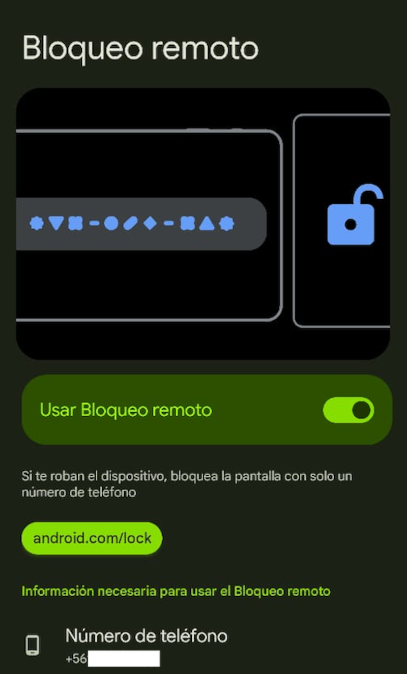 Otra novedad que se puede activar en ese mismo menú, es el Bloqueo Remoto mediante número verificado. Con esto, será más fácil que una persona bloquee el equipo ya que sólo deberá recordar su número de teléfono y activarlo siguiendo la web android.com/lock.