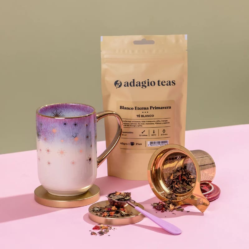 Y, si quieres ir más allá, puedes añadir a tu carrito una taza con un infusor dentro para que, en su ritual de tomar un té y descansar, pueda añadir directamente las hierbas mientras sirve el agua caliente.