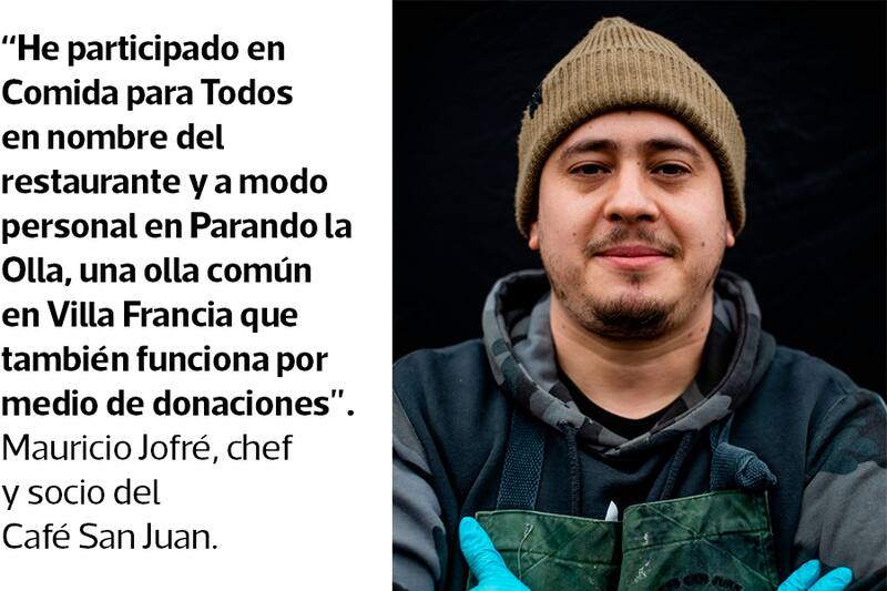 Otro cocinero que ha estado cocinando para ollas comunes es Mauricio Jofré, chef y socio del Café San Juan. “He participado en Comida para Todos en nombre del restaurante y a modo personal en Parando la Olla, una olla común en Villa Francia que también funciona por medio de donaciones. Recuerdo que ahí me tocó hacer pescado frito para mucha gente”, relata.