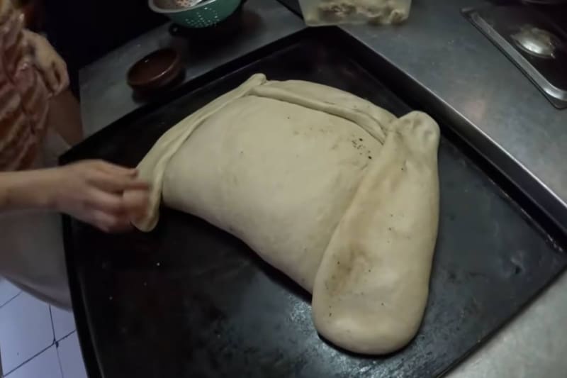 Después de tener lista la masa, la cocinera comenzó a rellenar la empanada, la dobló, le dio una pincelada con huevo y se fue directo al horno.