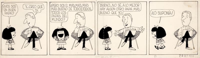El 29 de septiembre de 1964 salieron las primeras viñetas de Mafalda. Estas se ubicaron en las páginas 22 y 64 del periódico y en una de ellas se puede ver una conversación que sostiene con su papá.