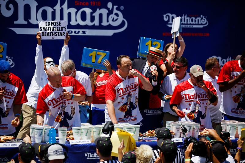 Joey Chestnut (38), considerado como el rey de las competiciones de tragar comida que se celebran en Estados Unidos, volvió a coronarse como campeón tras comer 63 hot dogs en diez minutos.