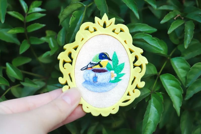 Sus bordados los realiza en distintos formatos: bastidores, medallas e incluso en hojas de árboles. En todos ellos ha ilustrado con hilos al sietecolores.