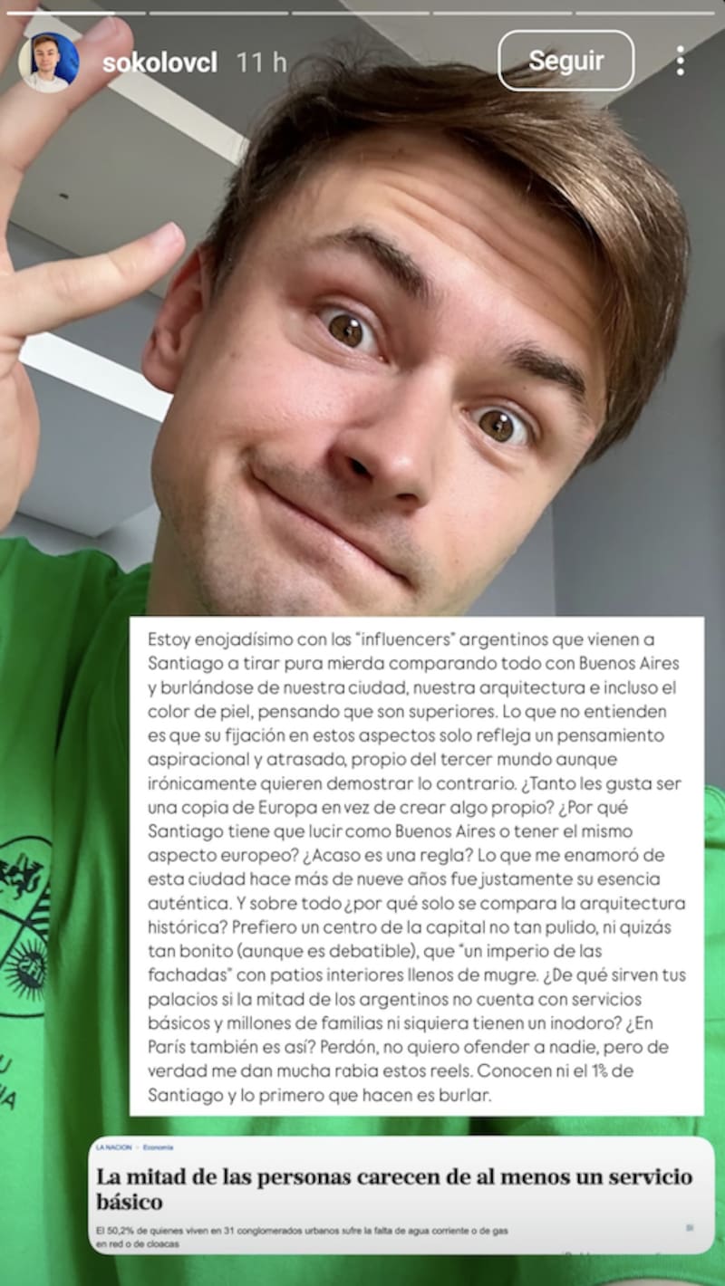 “Estoy enojadísimo con los ‘influencers’ argentinos que vienen a Santiago a tirar pura mier... comparando todo con Buenos Aires y burlándose de nuestra ciudad, nuestra arquitectura e incluso el color de piel, pensando que son superiores”, señalaba la publicación.