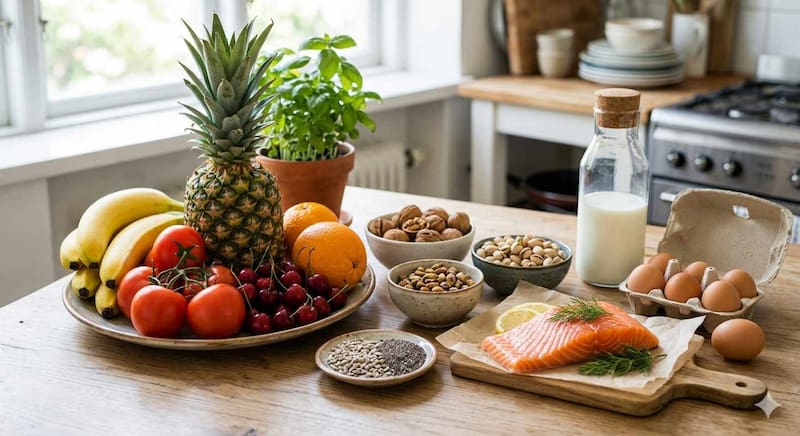 - Frutas y verduras (plátano, piña, naranja, tomate, cerezas).
