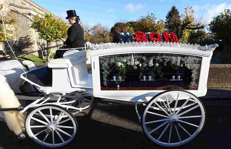 La parte superior del carruaje que transportaba el cuerpo de Liam Payne hacia la iglesia tenía dos visibles arreglos florales: uno decía “hijo” y el otro “papá”.