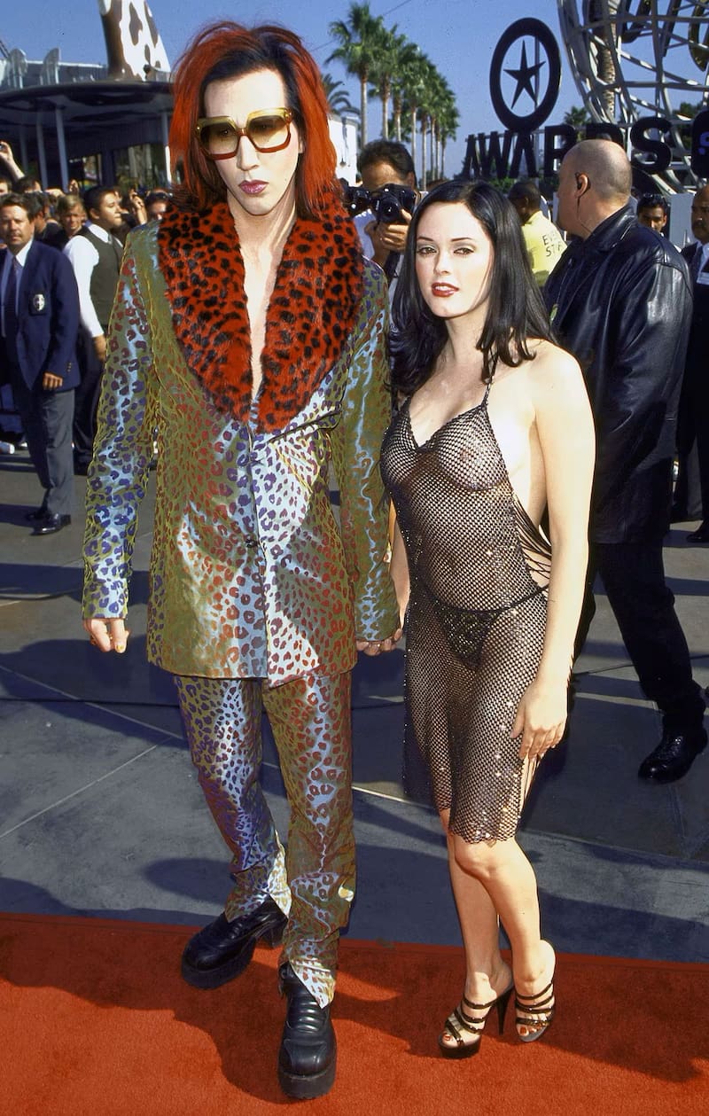 La exactriz Rose McGowan también desató la polémica por vestir una prenda transparente, en su caso en los MTV Video Music Awards de 1998. De la mano de su novio de ese momento, Marilyn Manson, McGowan apareció con un vestido de malla negra que dejaba ver gran parte de su cuerpo.