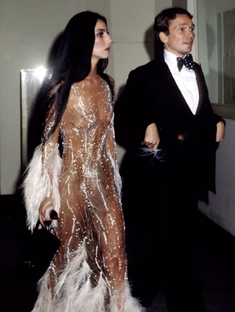 Cheryl Sarkisian, mejor conocida como Cher, deslumbró durante la Gala del Met de 1974 al utilizar un atuendo transparente que tenía mangas con plumas blancas y brillos. La prenda, diseñada por Bob Mackie, daba la apariencia de una segunda piel.